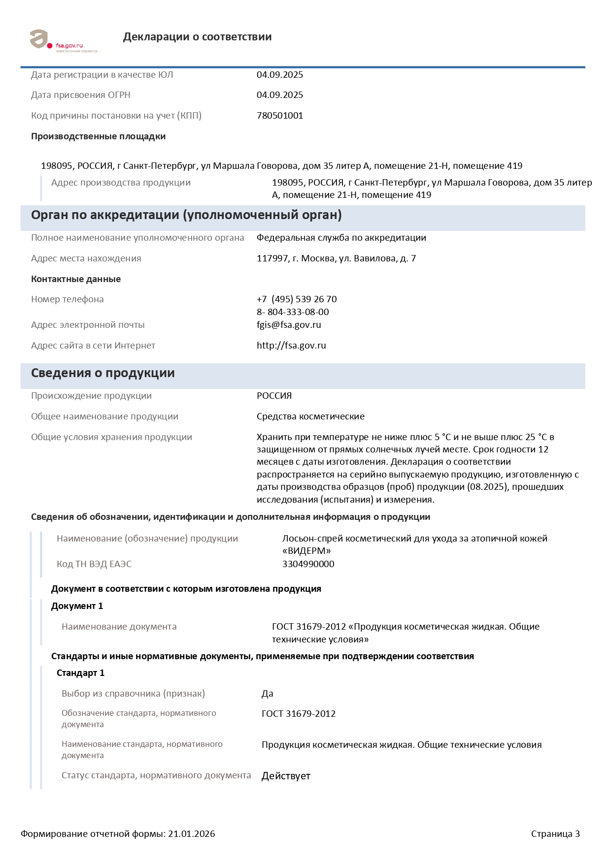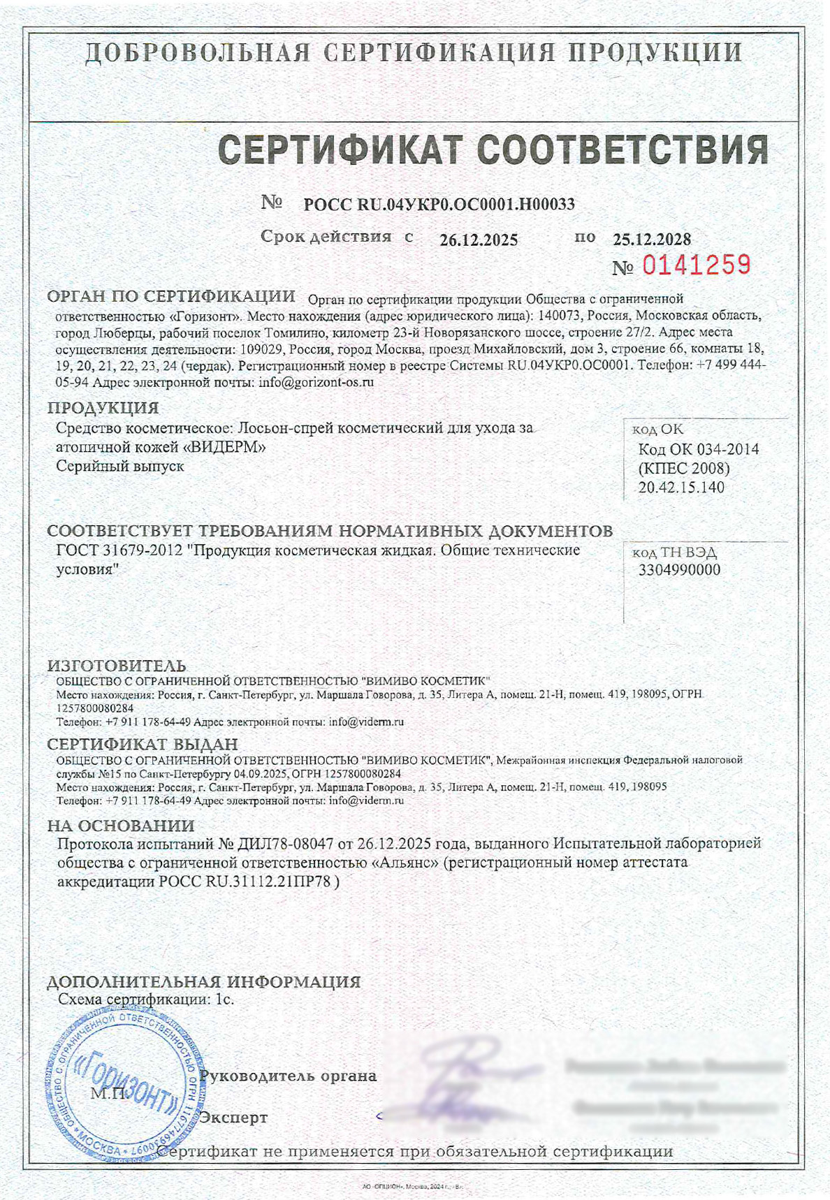 Мы открыты для любых лабораторных исследований. Убедитесь в безопасности ВИДЕРМ, ознакомившись с нашими документами. Нажмите на миниатюру, чтобы развернуть фото.
